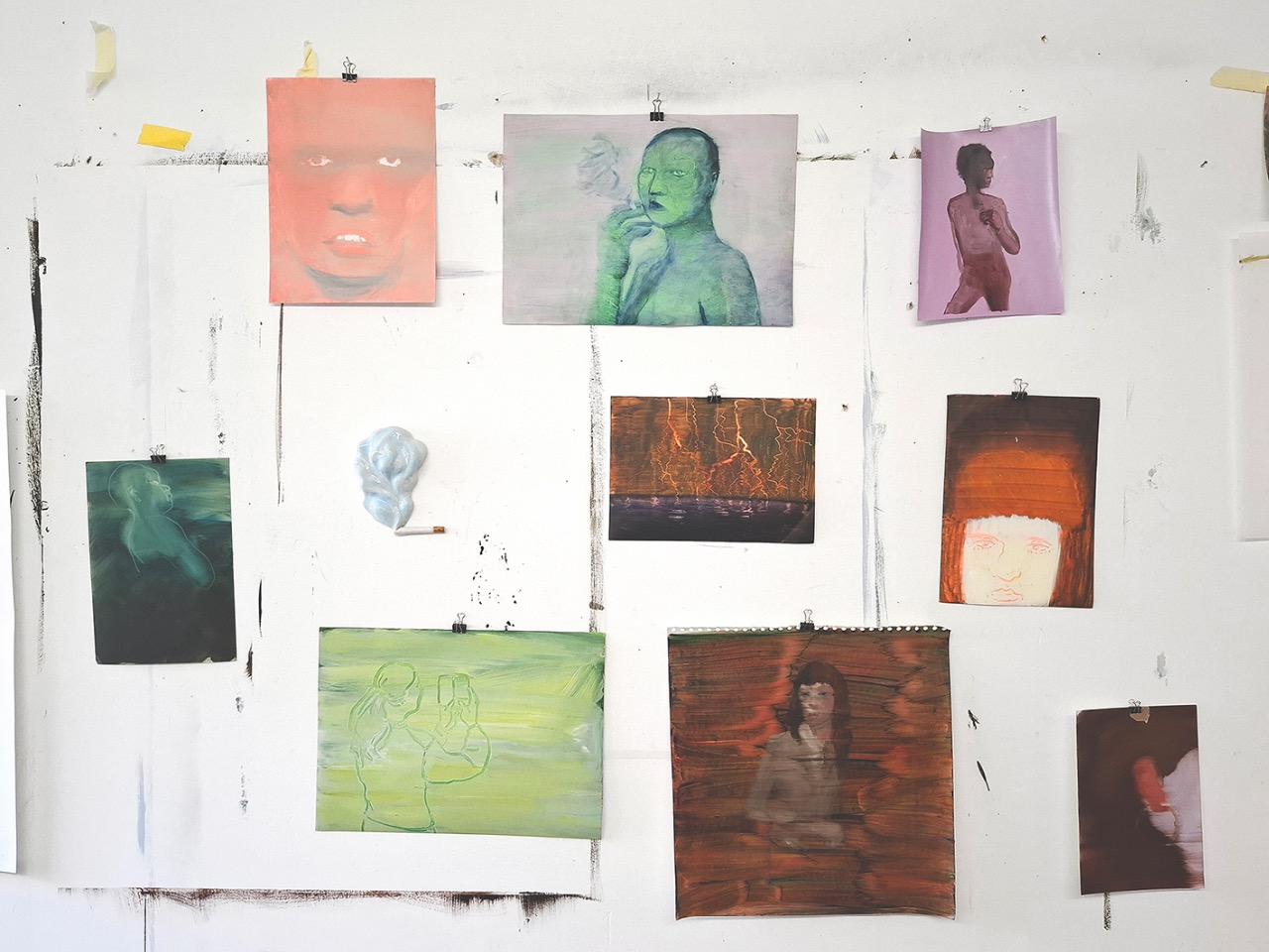 An einem Metallgerüst montiert gibt es auch Verweise auf gewohnte Arbeitsweisen der Künstlerinnen, der Auseinandersetzung mit der menschlichen Darstellung und dessen Optimierung in der Medienwelt. Daneben sieht man lose Tapetenbahnen, die darüber gehängt oder abgelegt sind und die, wie es scheint, noch auf ihre Verarbeitung warten.
